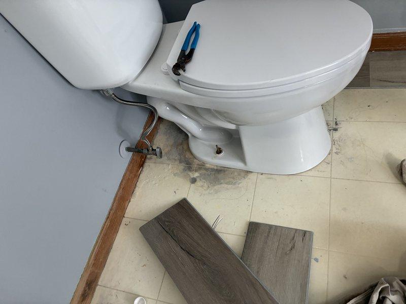 Responded to service call regarding toilet installation. Removed existing toilet, cleaned mounting surface, and reinstalled fixture with new wax ring and mounting hardware. Noted adjacent flooring is in process of replacement with visible laminate materials staged nearby for installation.