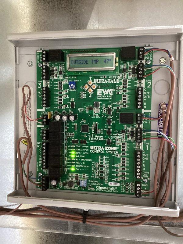 Performed diagnostic inspection of the UltraTalk ZWC Control Pro system with functioning LCD display indicating proper outside temperature reading of 47°. Verified all zone controls (1-3) were operational and confirmed proper terminal connections on the main circuit board. System showing normal operation with green indicator light confirming power status.