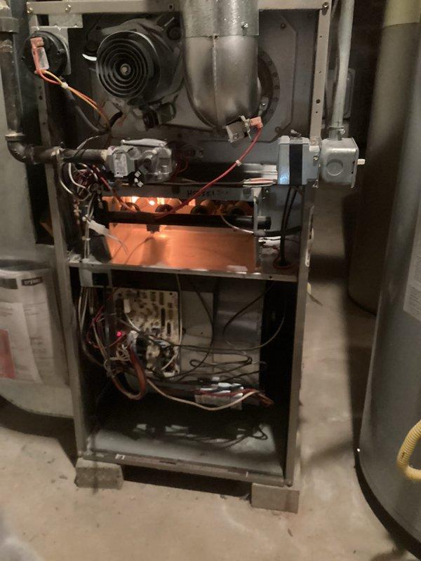 Performed routine maintenance tune-up on customer's furnace. Inspected internal components including control board and wiring connections. Furnace is operational with all safety systems functioning properly.
