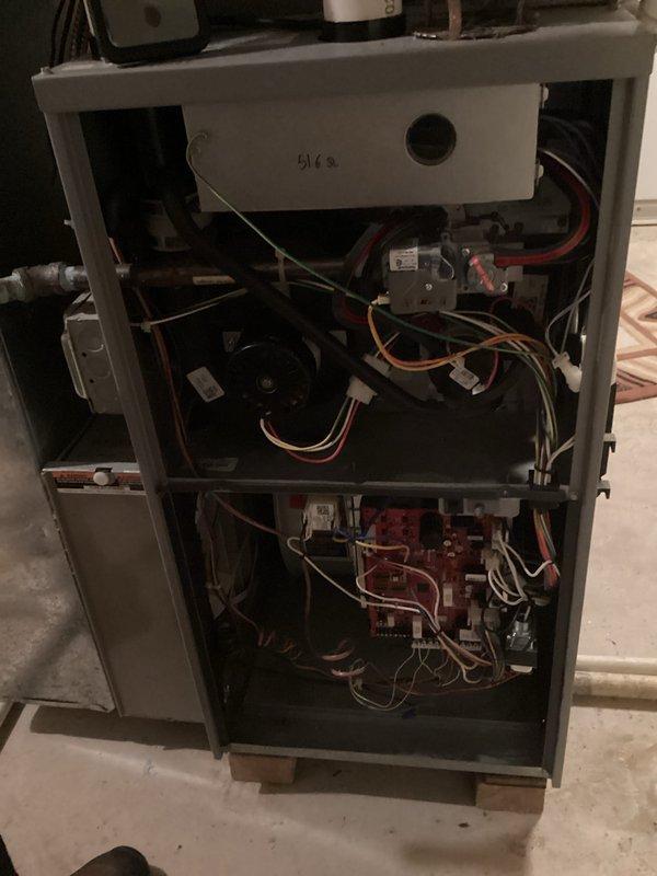 Performed comprehensive tune-up on residential heating system, including inspection of internal electrical components and control board connections. Verified integrity of wiring connections (red, white, green, yellow) to ensure proper communication between thermostat and furnace controller. System operational with no immediate issues identified.
