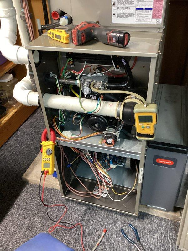Conducted comprehensive diagnostic testing on HVAC system using electronic measurement tools. Opened furnace cabinet to inspect internal components including control board, motor assembly and drainage system. Performed electrical testing of system circuits with multimeter to verify proper operation of Honeywell control panel and associated wiring connections.