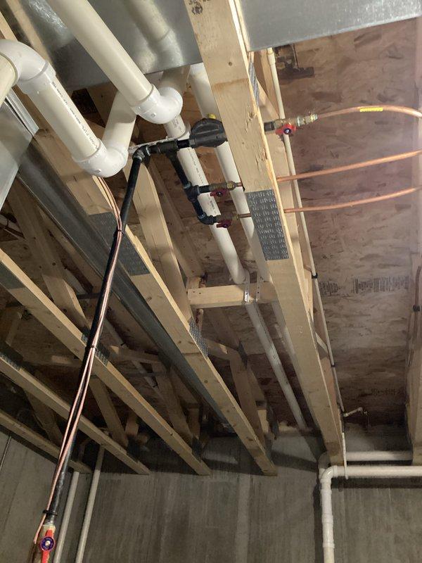 Completed plumbing repair in crawlspace/basement area involving inspection and potential replacement of PVC and copper pipe components. Service included maintenance of connections at valve junction points where the supply system interfaces with drainage components within the structural framework.