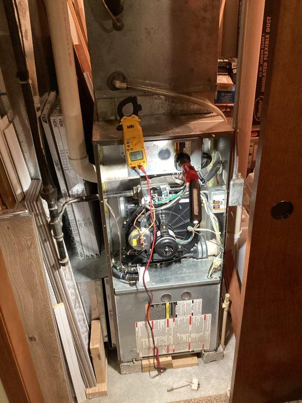 Performed comprehensive furnace tune-up which included removing access panel for full component inspection. Conducted electrical testing with clamp meter to verify proper voltage and amperage readings on control board and wiring connections. Measured gas pressure using digital manometer, confirming readings of 3.50/3.45 inWC, which are within manufacturer specifications for this unit. All diagnostic tests indicate system is operating correctly with no issues detected.