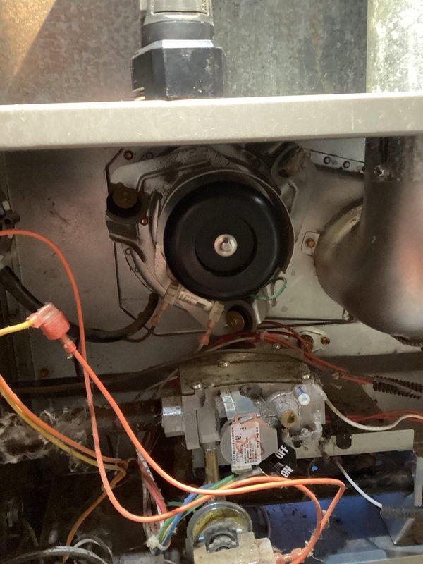 Diagnosed faulty motor in HVAC system causing no-heat condition. Replaced blower motor assembly, reconnected wiring harness (orange, yellow, and green wires), and verified proper operation. System now functioning within normal parameters with restored heat output.