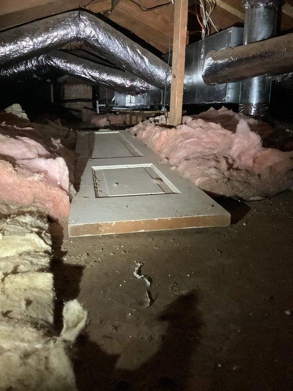 Inspected attic HVAC ductwork system. Observed standard metal ducts with reflective insulation in good working condition, supported by structural beams. Noted some disturbed fiberglass insulation between floor joists requiring adjustment for optimal system efficiency.