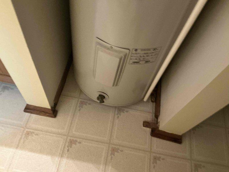 Conducted inspection of existing water heater system installed in residential utility closet. Unit appears to be standard cylindrical tank-type water heater mounted on tiled floor with visible specification label and access panel. Evaluated surrounding installation area including clearances, piping connections, and ventilation requirements for potential replacement options.