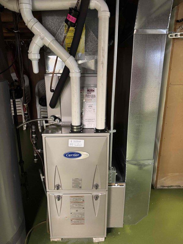 Performed follow-up inspection on recently installed Carrier furnace system. Verified proper installation of PVC ventilation components, confirmed secure connections on all ductwork, and checked electrical connections at junction box. System appears to be operating as designed with no visible issues or concerns.