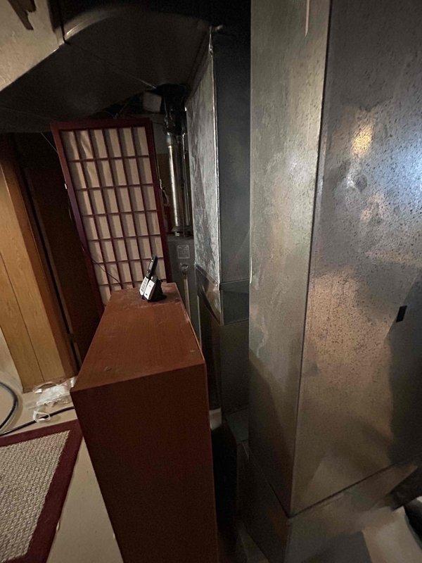 Conducted inspection of existing HVAC system in utility area, documenting aging ductwork, water heater connections, and associated plumbing infrastructure. Identified several sections of galvanized metal ducts with multiple bends and joints showing signs of deterioration, along with plumbing components exhibiting minor corrosion at connection points. Recommended full system replacement to address efficiency concerns and prevent potential future failures.