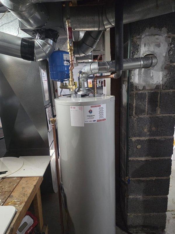 Completed installation of a new water heater system in utility room, including proper connection of copper supply lines, installation of expansion tank, and verification of all fittings. System was tested for proper operation and pressure, with no leaks detected.