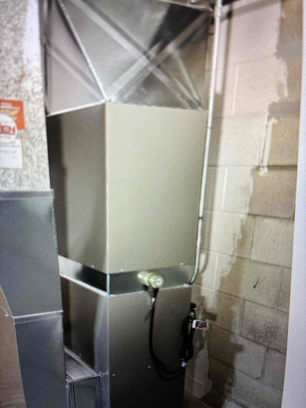 Conducted comprehensive assessment of existing HVAC system including metal furnace unit with associated ductwork and pressure components. Identified potential moisture concerns evidenced by water staining on adjacent concrete block wall. Documented system condition with photographs for complete evaluation of indoor air quality factors and equipment performance.