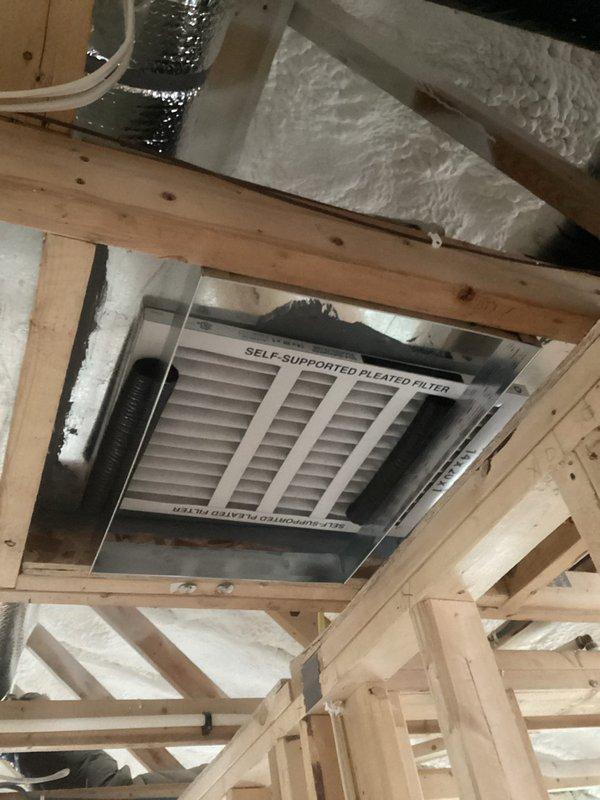 Installed new ductwork system with a self-supported pleated filter unit in unfinished space. Properly secured filter housing to wooden frame structure and connected to existing metal ductwork. System installation completed in area with spray foam insulation for optimal airflow efficiency.