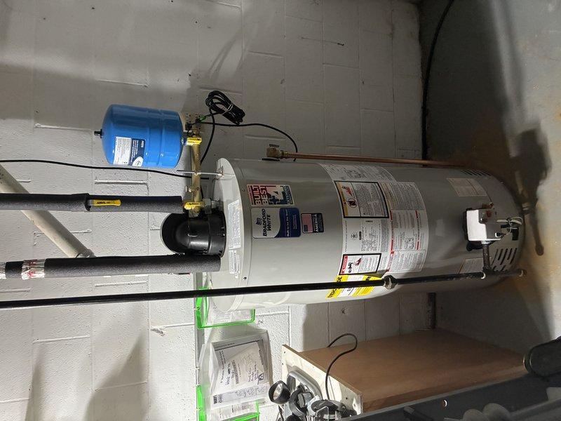 Installed new tanked water heater in utility room, complete with expansion tank and all required connections. Verified proper operation of valves and connections. System is functioning normally with no issues detected.