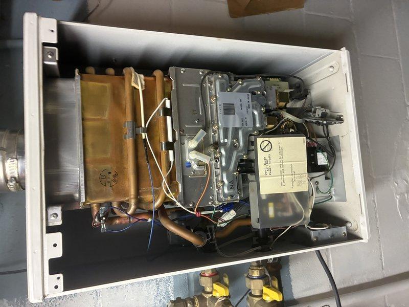 Completed installation and startup of tankless water heater system with all internal components properly mounted and configured within white metal enclosure. Verified proper connections of copper supply lines, gas valves with yellow handles, heat exchanger assembly, control board wiring, and circuit panel functionality, with all piping extending through floor penetrations and system tested for safe operation.