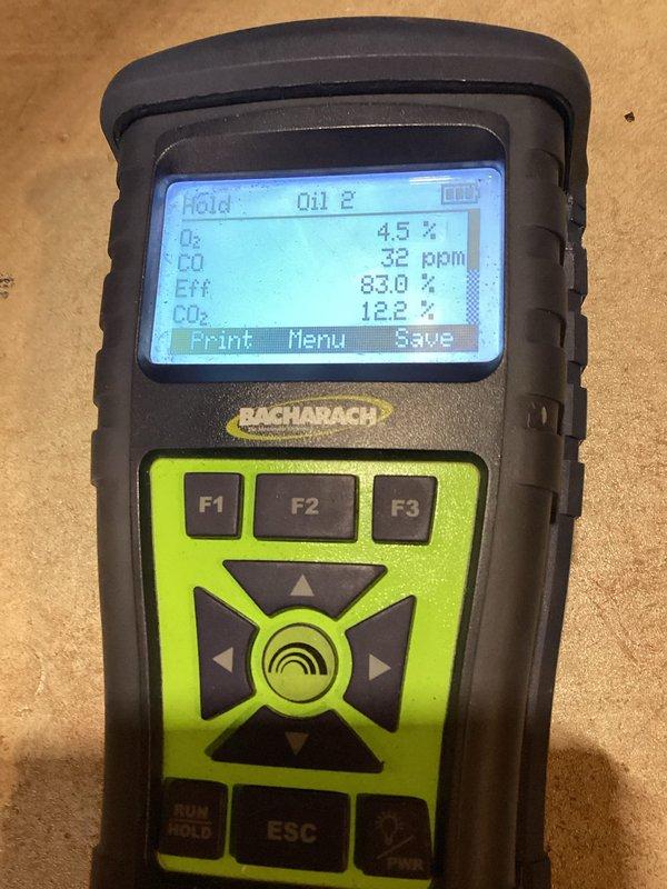 Completed install callback and performed combustion analysis on recently installed heating system. Bacharach combustion analyzer readings confirmed proper operation with oxygen levels at 4.5%, carbon monoxide at 32 ppm, efficiency at 83.0%, and carbon dioxide at 12.2%, all within acceptable parameters for safe and efficient system performance.