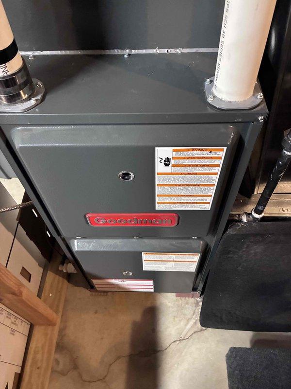 Inspected Goodman furnace system during callback service. Verified proper installation of intake and exhaust venting, confirmed all safety labels were intact, and examined overall condition of unit. System appears to be functioning correctly with no visible damage or installation issues.