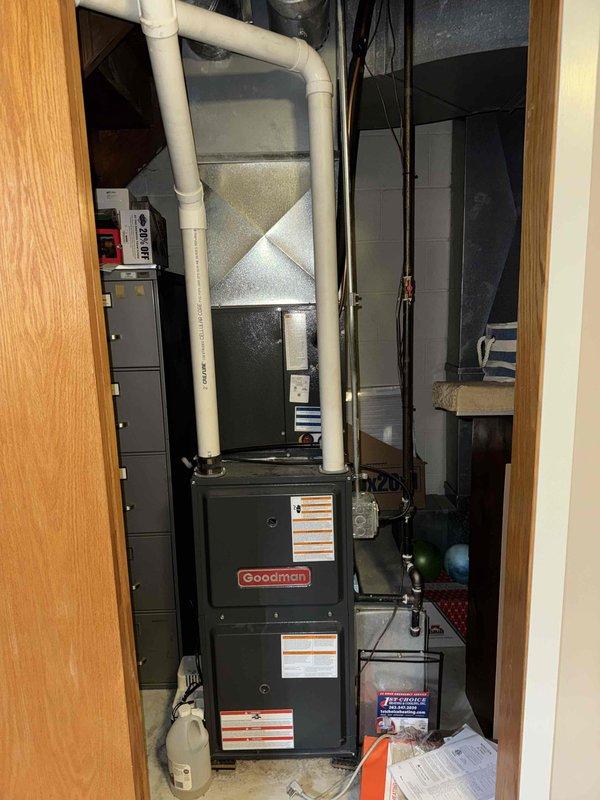 Successfully installed new furnace unit in basement utility room, complete with proper connection of all necessary ductwork, electrical components, and gas lines. Installation included positioning the unit in corner location with limited space, securing all connections, and verifying proper operation before completion.