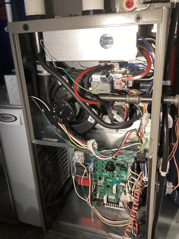 Completed comprehensive annual tune-up on customer's furnace system, inspecting all internal components. Removed front panel to access and clean blower assembly, check electrical connections, and verify proper operation of motor. Examined circuit boards and control wiring for any signs of wear or damage - all components functioning normally. System returned to service in good operating condition.
