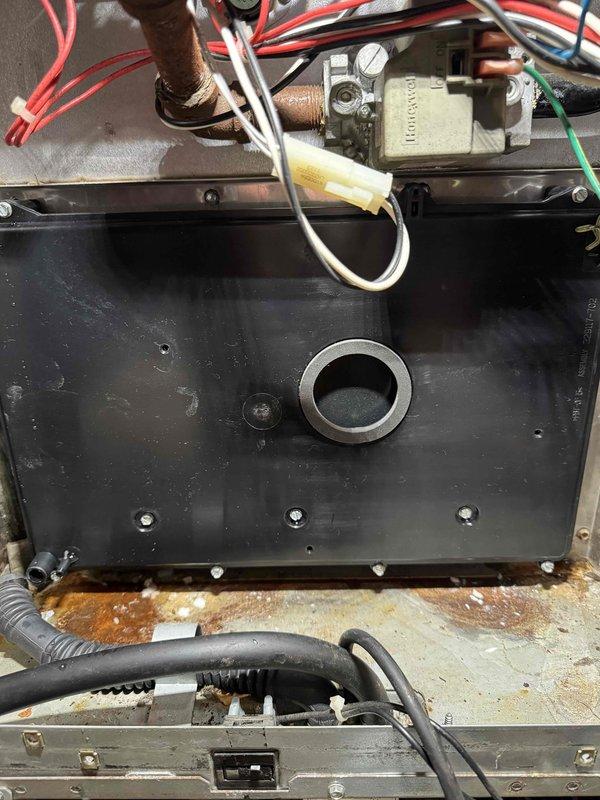 Inspected aging furnace system revealing significant corrosion at unit base and examined Honeywell control valve assembly. Noted extensive rust damage indicating prolonged moisture exposure affecting internal components, particularly around the circular access panel area. Documented condition with photos for comprehensive evaluation of system integrity.