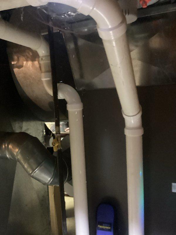 Responded to callback regarding improperly sealed condensate drain lines. Upon inspection, identified excessive red PVC cement/primer around pipe connections causing wall staining. Cleaned affected areas, resealed connections properly, and verified drainage system functionality.