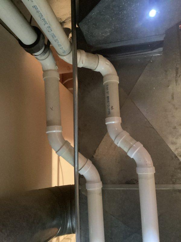 Completed comprehensive inspection of drainage infrastructure in utility space. Verified integrity of PVC pipe configuration including multiple elbow joints and U-shaped pathway. All connections and coupling bands were confirmed secure with no signs of leakage.