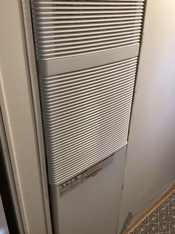 Conducted visual inspection of wall-mounted HVAC unit. System appears to be in good working condition with clean installation and no visible damage or deterioration. Unit is properly secured to wall with adequate clearance for optimal airflow.