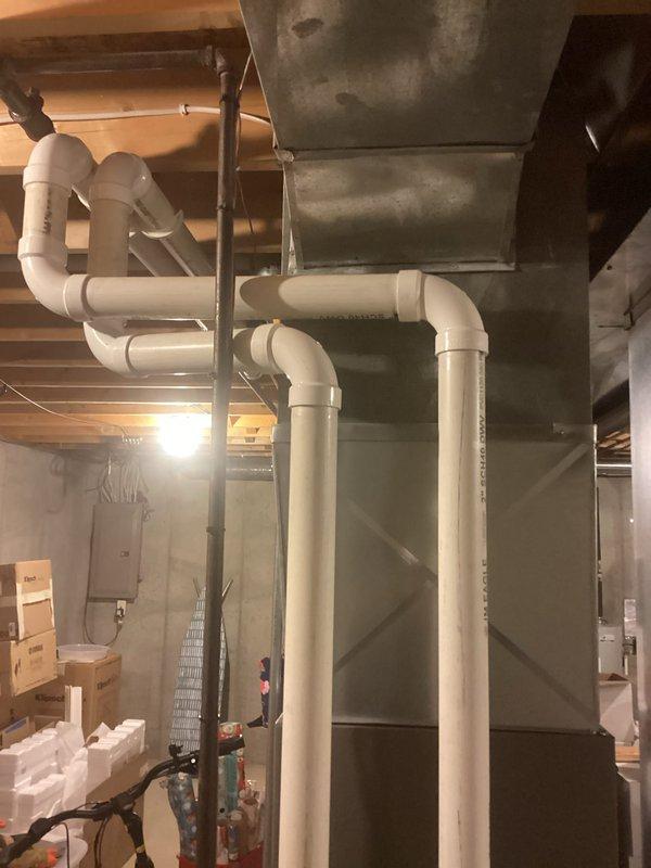 Performed routine maintenance inspection on residential HVAC system in basement utility area. Examined main ductwork system, drainage components, and PVC ventilation pipes - all connections secure with no visible leaks or damage. System functioning properly with no issues requiring repair at this time.