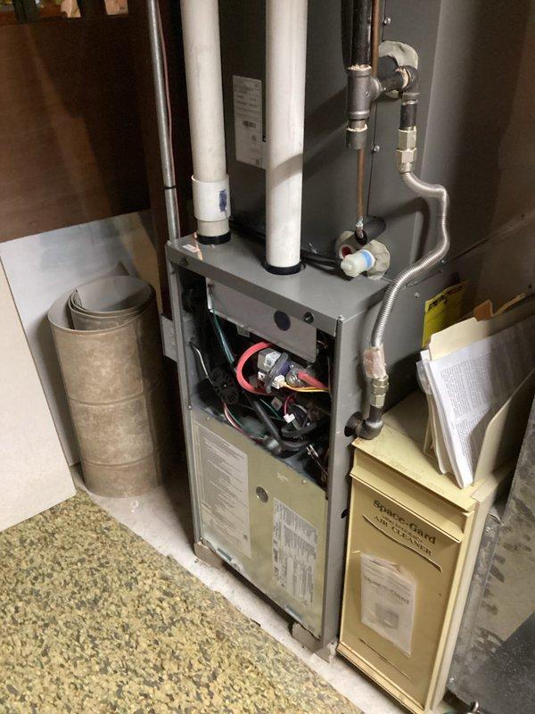 Completed comprehensive tune-up and maintenance of residential HVAC system in basement utility area. Inspected furnace internal components (control board, motor, wiring) with front panel removed for thorough examination. Evaluated gas line connection and PVC exhaust/intake pipes, along with associated drainage and condensate removal system to ensure proper function and prevent potential issues.
