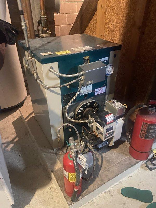 Performed comprehensive preventive maintenance on residential heating system. Inspected furnace/boiler unit, associated piping, and safety equipment including fire extinguisher. System appears to be in functional condition with no visible signs of damage or leakage.