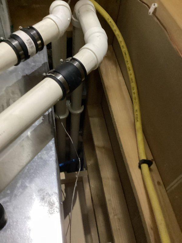 Performed visual inspection of plumbing system infrastructure in utility area. Verified proper installation of PVC piping components with secure black connector rings at junction points. Yellow supply line with measurement markings was confirmed properly fastened to structural framing. All components appeared clean with no evidence of leaks or damage requiring repair.