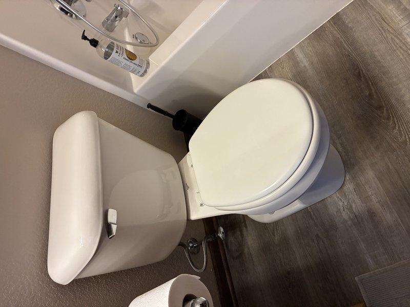 Conducted detailed assessment of existing toilet installation in bathroom with gray wood-look flooring. Fixture appears to be standard white porcelain model in good working condition with proper wall clearance and functional paper holder adjacent to unit. No visible leaks or installation issues identified during inspection.