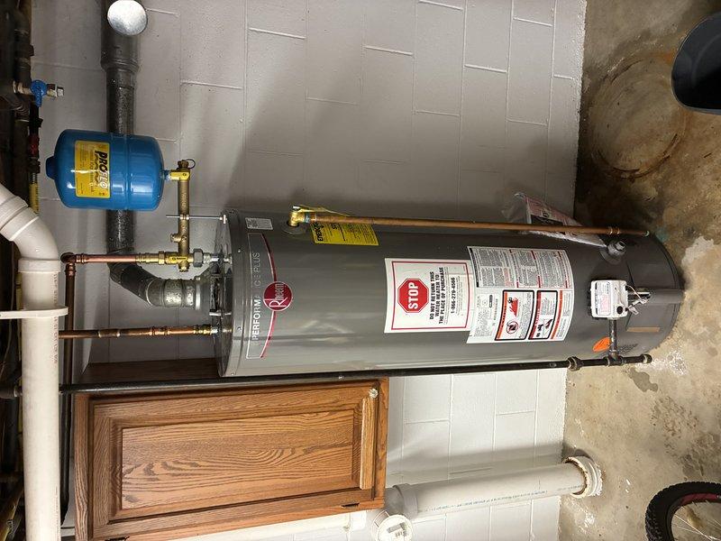 Successfully installed a new residential water heater in the utility area, complete with proper copper pipe connections and brass fittings. Mounted blue expansion tank to vertical pipe and ensured all safety components were correctly installed. System was tested and confirmed to be functioning properly with no leaks detected.