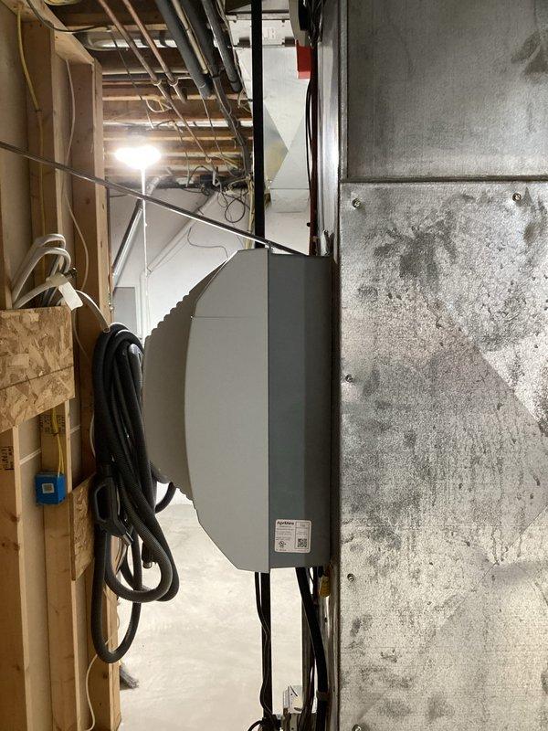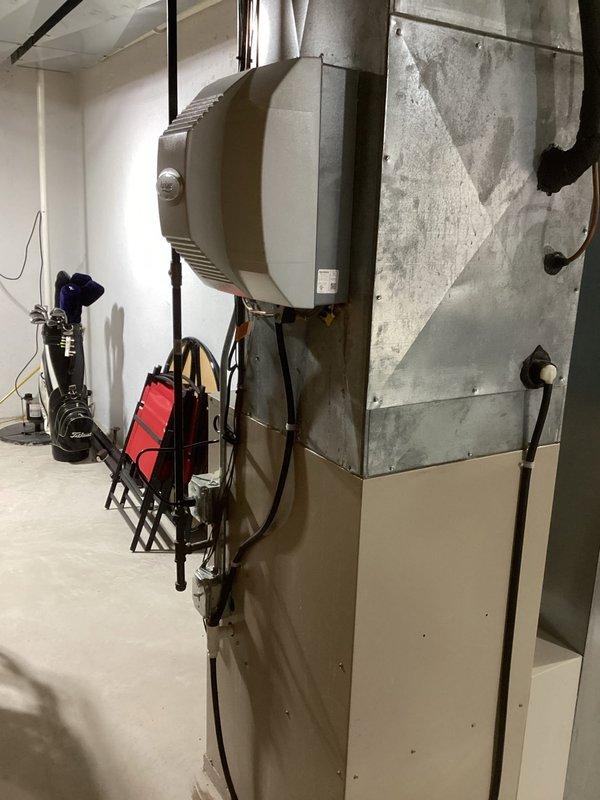 Completed installation of new HVAC system in customer's basement utility area. Unit properly mounted with all required connections secured and tested. System includes upgraded IAQ components for improved indoor air quality performance.