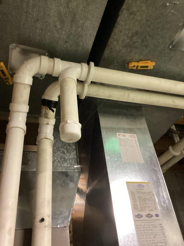 Performed scheduled maintenance inspection on plumbing infrastructure. Examined PVC pipe system including elbow joints and connections for proper installation and signs of leaks. Inspected adjacent utility equipment and verified secure mounting of all components to wall/ceiling brackets.