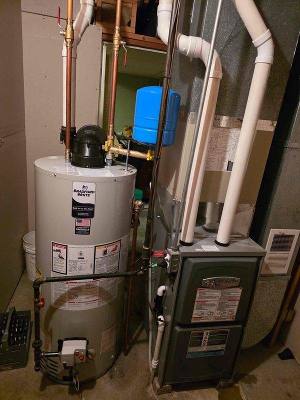 Completed installation of HVAC system components in residential utility room, including proper integration of Bradford White water heater with expansion tank and associated copper plumbing connections. Installed and configured furnace unit with PVC venting system, ensuring all drainage and ventilation pipes were properly routed and secured per manufacturer specifications and local building codes.