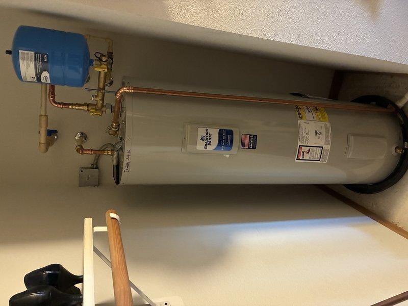 Successfully installed a new tanked water heater system in utility area, including proper connection of copper supply lines and PVC drainage. System was fitted with an expansion tank and all necessary valves to ensure code compliance and optimal performance.