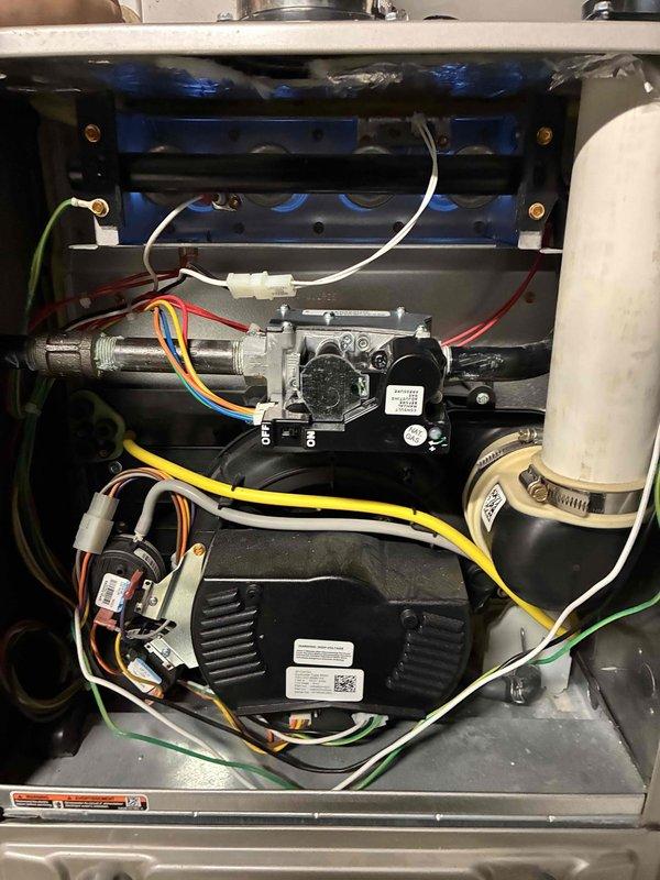 Performed comprehensive tune-up and safety inspection on residential gas furnace system. Accessed internal components, verified proper operation of blower motor and gas valve assembly, inspected electrical connections and wiring harnesses, checked intake and exhaust venting system, and replaced air filter to ensure optimal system performance and efficiency.