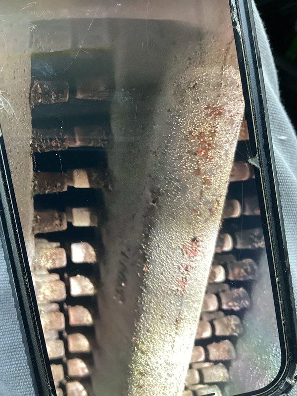 Responded to no heat complaint on aging system (10+ years). Visual inspection revealed heavy condensation and fogging on access panel window with significant water accumulation. Further examination showed internal components with brownish discoloration and potential rust formation on heating coils/evaporator fins. Cleaned affected areas, restored proper heating function, and advised customer on system's age-related deterioration.