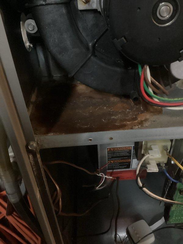 Performed diagnostic assessment on aging HVAC system (10+ years old) with no heat complaint. Inspection revealed significant corrosion and rust on interior components, particularly the heat exchanger platform, and identified faulty electrical connections with worn wiring at the blower motor assembly. Cleaned critical components, restored proper electrical connections, and restored heating function.