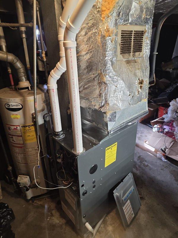 Completed installation of new furnace unit in basement area, which included integration with existing PVC ventilation system. Performed internal component inspection and verified proper electrical connections to control system. All systems tested and functioning correctly.