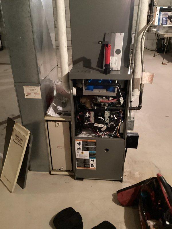 Performed scheduled maintenance on furnace system including electrical component inspection and diagnostic testing using multimeter. Accessed and examined internal wiring and control components, ensuring proper electrical connections and function. Utilized portable work light for thorough visual inspection of all internal components.