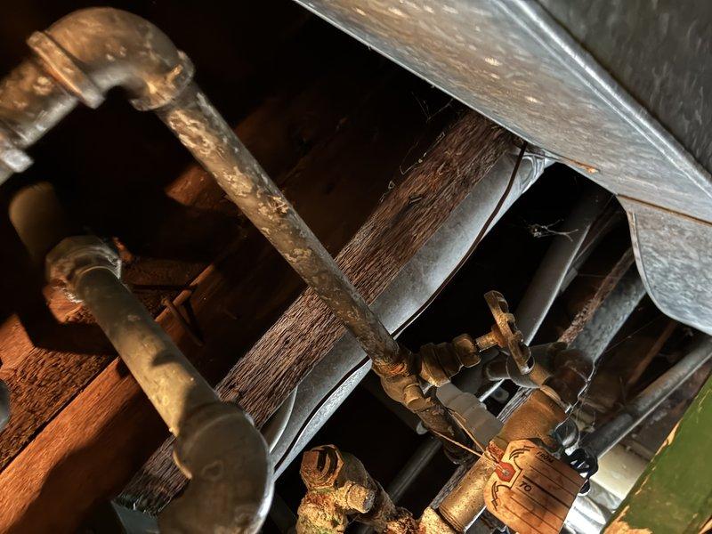 Inspected aging copper plumbing system in confined area beneath floor/wall cavity. Observed significant oxidation and tarnishing on pipes, fittings, and joints. System appears functional despite age-related deterioration; no active leaks detected at valves and connectors.