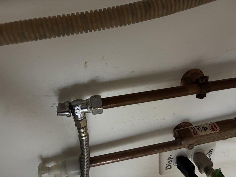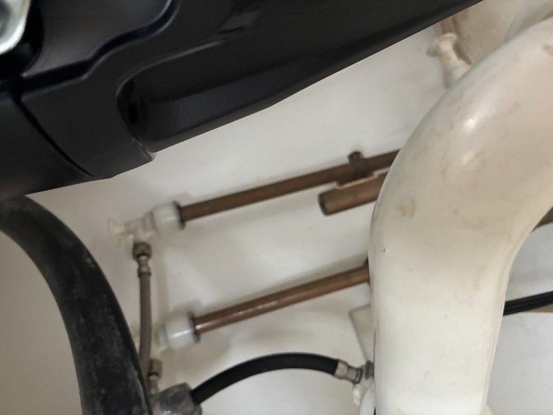 Installed flexible braided stainless steel supply line to existing copper water supply piping using compression T-junction fitting. Connected new faucet supply hose to oxidized copper pipes secured with metal brackets, ensuring proper water flow and leak-free connections to updated fixture.