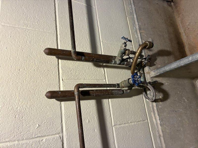 Inspected aging copper plumbing installation with multiple 90-degree bends and joints mounted on white concrete block wall. Observed brass shutoff valve with blue handle/tag and noted natural patina development on horizontal copper sections. System appears functional despite age-related discoloration, particularly at connection points and exposed piping areas.