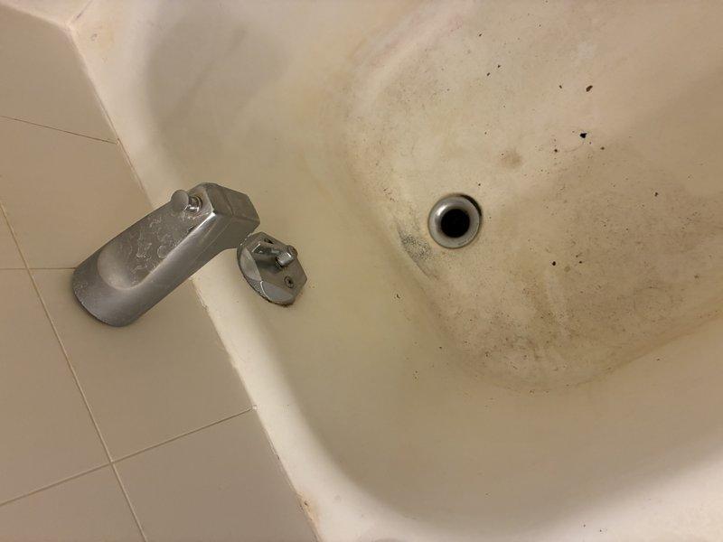 Conducted plumbing estimate for bathtub fixture replacement and refinishing. Assessed existing bathtub condition, noting significant surface deterioration, staining, and buildup requiring comprehensive restoration or full fixture replacement. Documented chrome faucet assembly and drain components for potential upgrade recommendations.