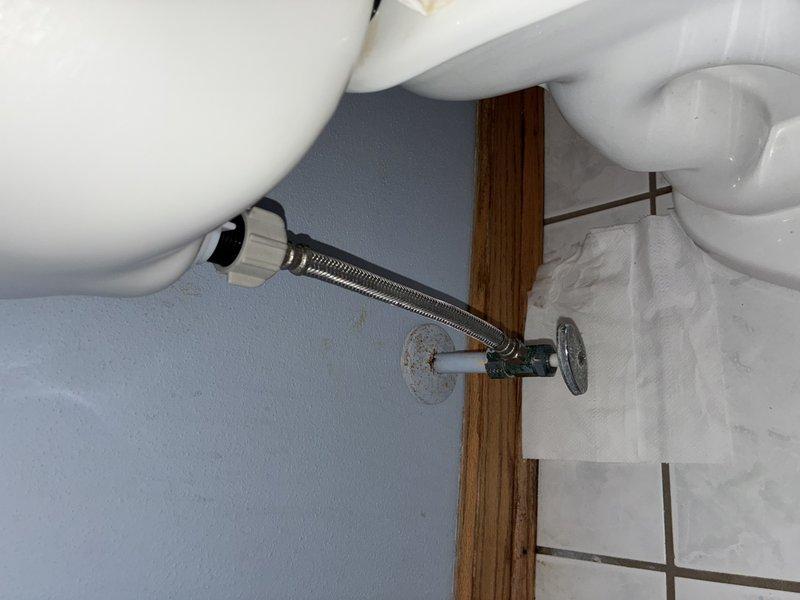 Completed installation of toilet water supply line and shut-off valve assembly. Installed chrome-finished angle stop valve with escutcheon plate at wall connection point and connected flexible braided stainless steel supply line from valve to toilet tank inlet, ensuring proper positioning and secure connections without leaks.