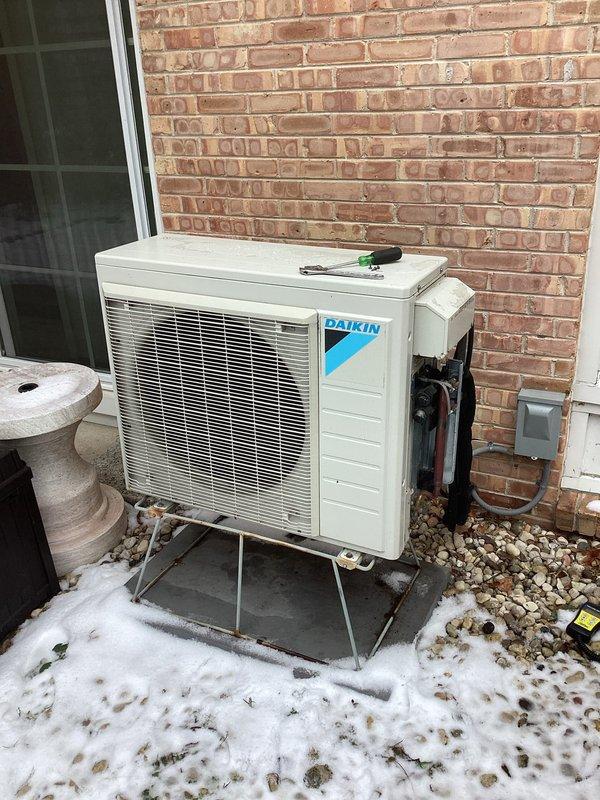 Responded to no heat complaint on Daikin mini-split system. Inspected indoor wall-mounted head unit and outdoor condensing unit which was covered with snow. Connected gauge set to verify refrigerant pressures and performed system diagnostic. Cleared snow accumulation from around outdoor unit to restore proper airflow, allowing system to resume normal heating operation.
