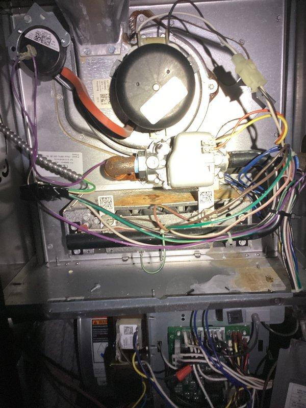 Diagnosed and repaired furnace with no heat issue. Inspection revealed damaged heat exchanger with corrosion and cracked burner tubes, along with disorganized wiring causing intermittent electrical problems. Replaced heat exchanger assembly, rewired electrical connections to factory specifications, and performed complete system test to verify proper operation.