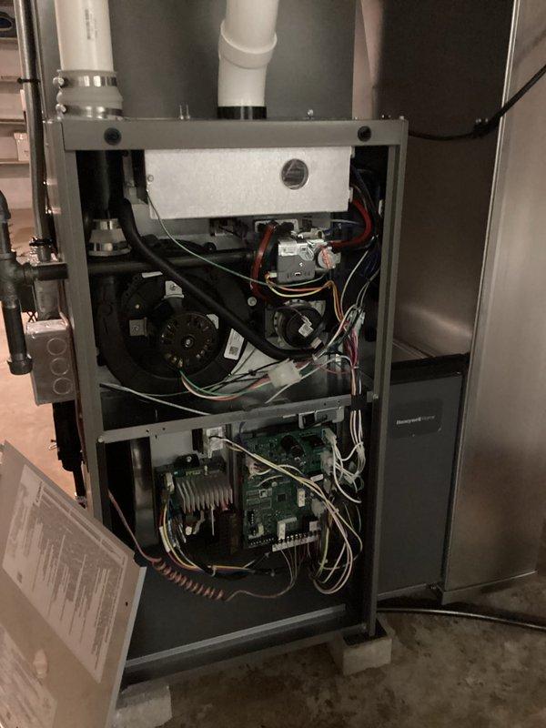 Performed diagnostic inspection of furnace with access panel removed. Inspected internal components including circuit board, motor assembly, wiring harnesses, and exhaust connections. No immediate issues identified during visual assessment.