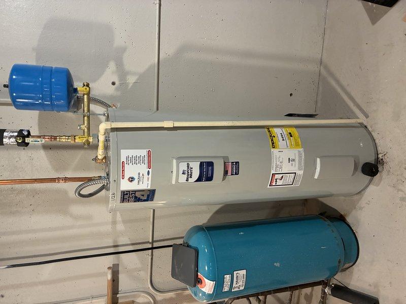 Successfully installed a new tanked water heater system with all required components, including a blue expansion tank and proper copper plumbing connections. System was properly secured, connected to existing water lines, and verified for correct operation with no leaks observed.