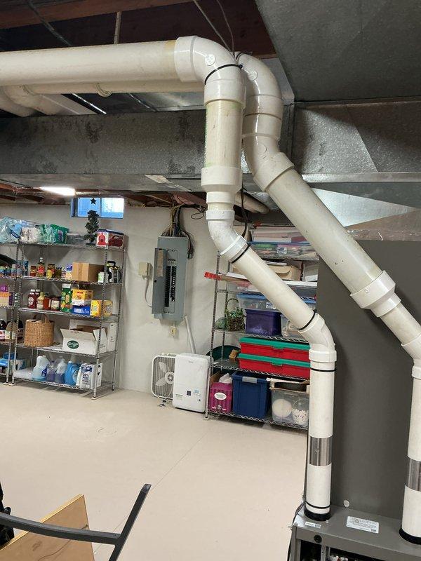 Conducted inspection and documentation of existing HVAC system configuration in utility area, noting current furnace unit placement and adjacent components. Evaluated PVC ventilation piping system, confirming proper SDB 25 specification compliance and structural support integrity. System appears to be installed in corner location with appropriate clearances and connections for replacement consideration.